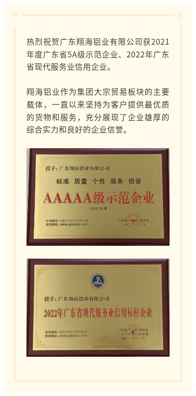 喜报 | lejing登录入口铝业获评广东省5A级示范企业、现代服务业信用标杆企业